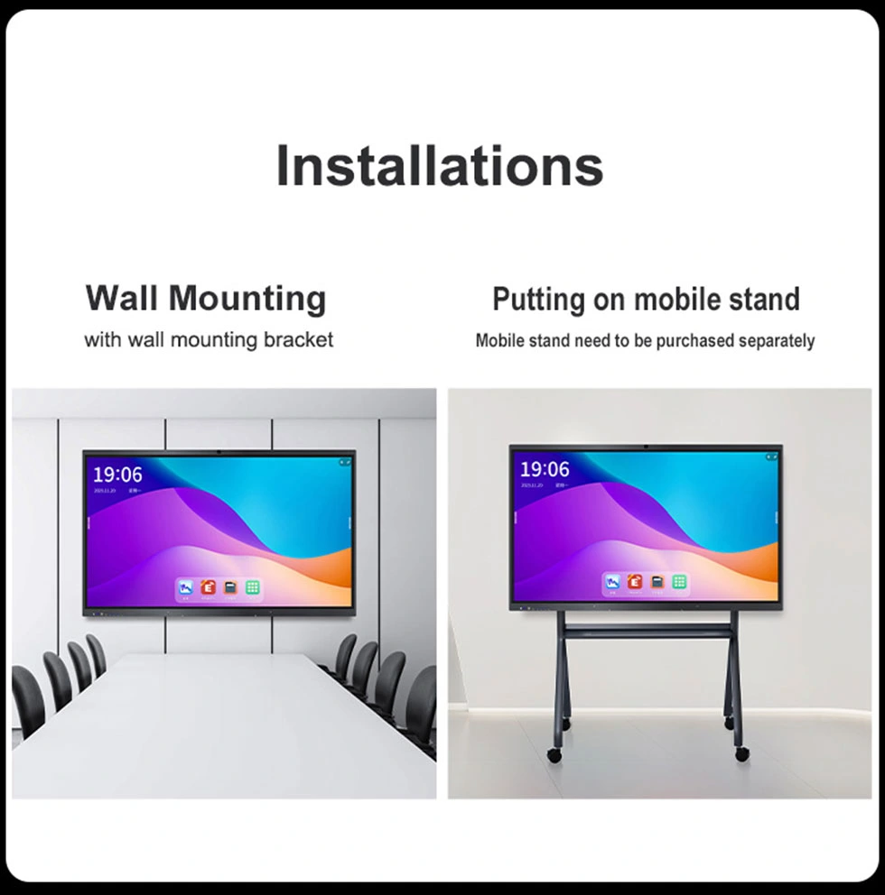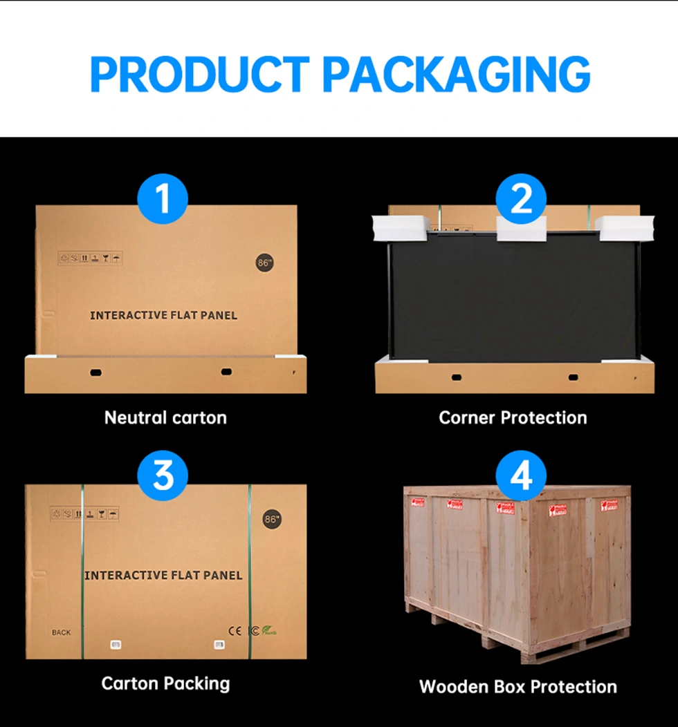 Màn hình phẳng tương tác được đóng gói an toàn trong thùng carton trung tính có lớp bảo vệ bằng hộp gỗ gia cố để vận chuyển an toàn.